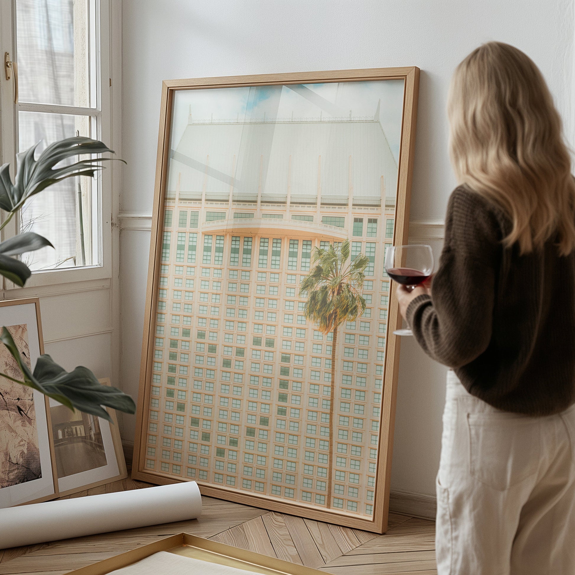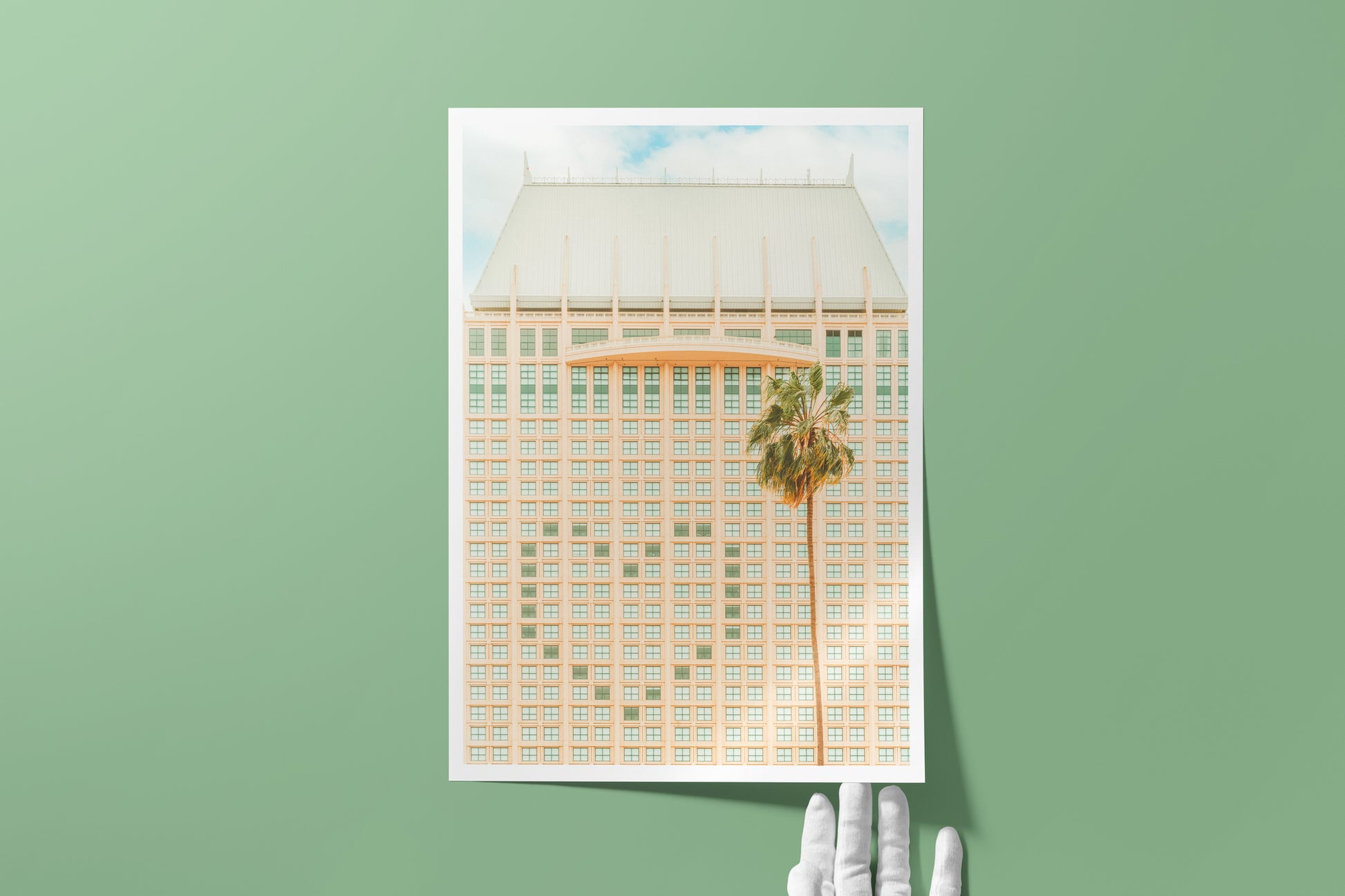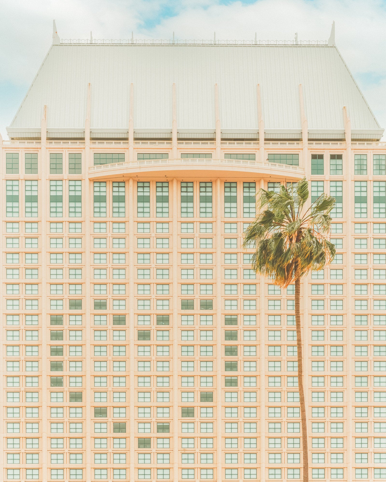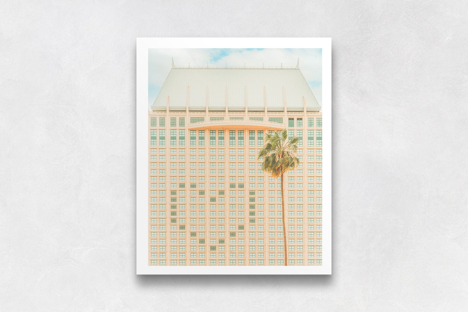 Pastel hotel grid with a single palm against a soft San Diego sky—a minimal architecture print.