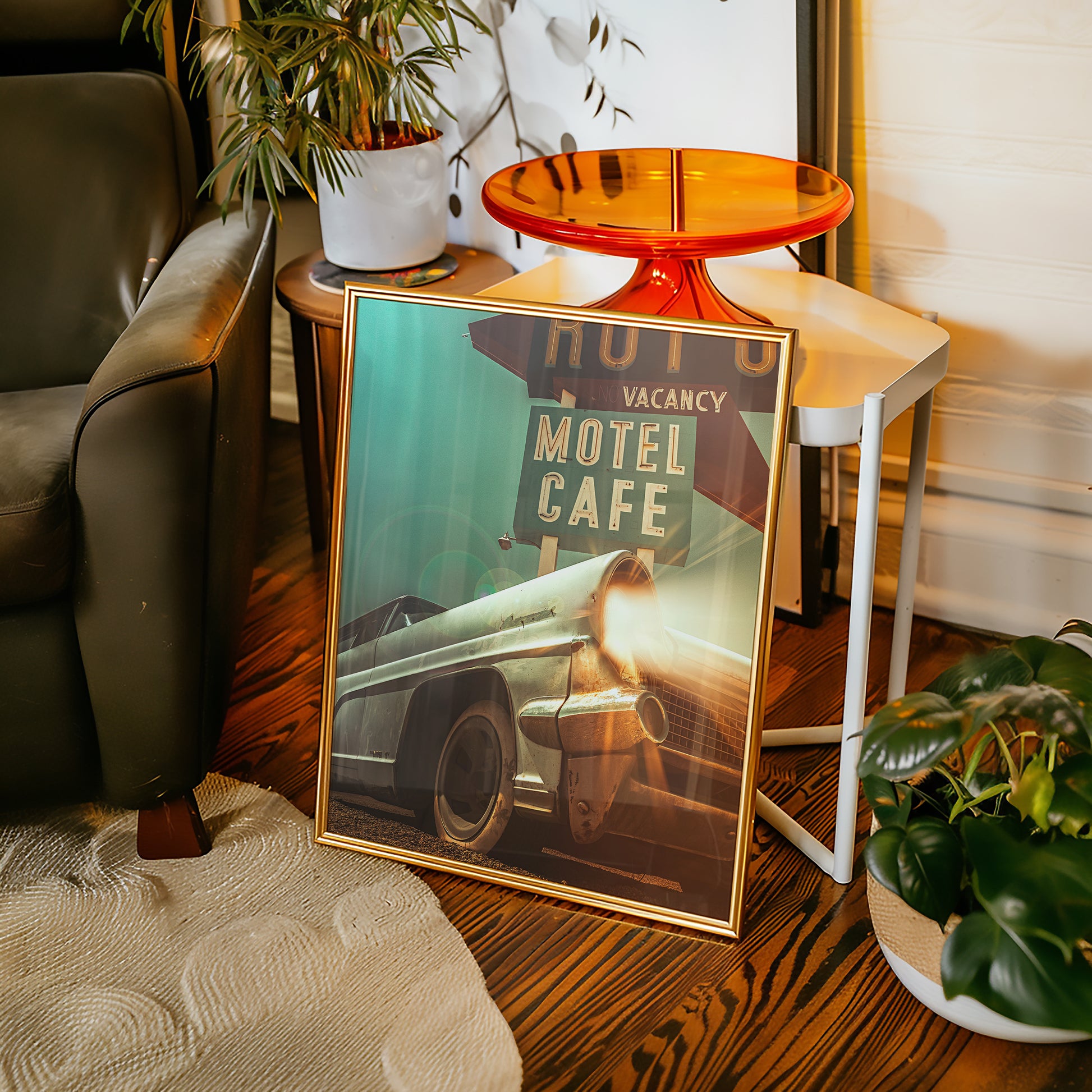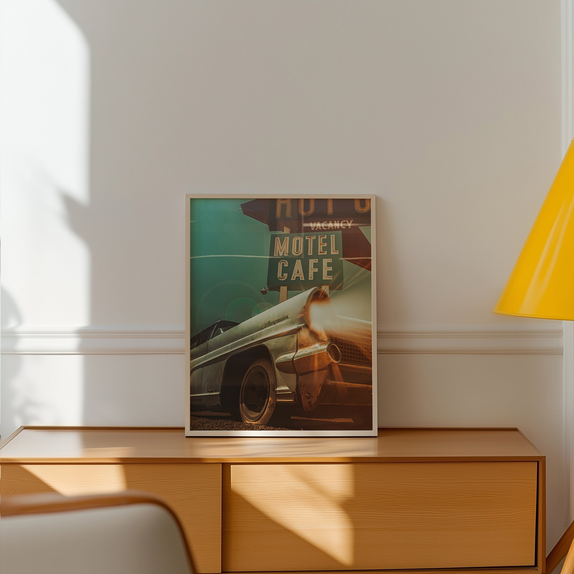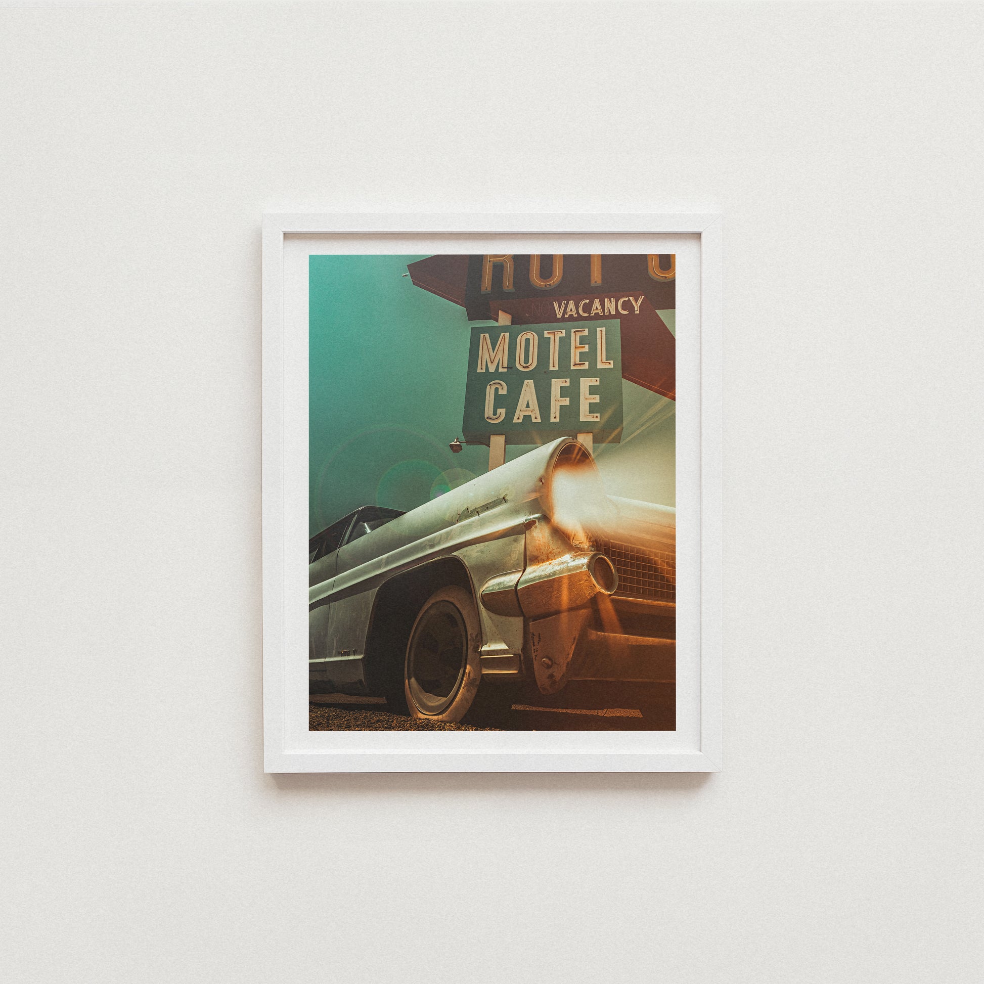 Award-winning cinematic composite built from my own photographs at the Route 66 gas station in Amboy, CA. The car and motel sign are original to the site; I added light beams, fog, and atmosphere for that old Route 66 vibe.