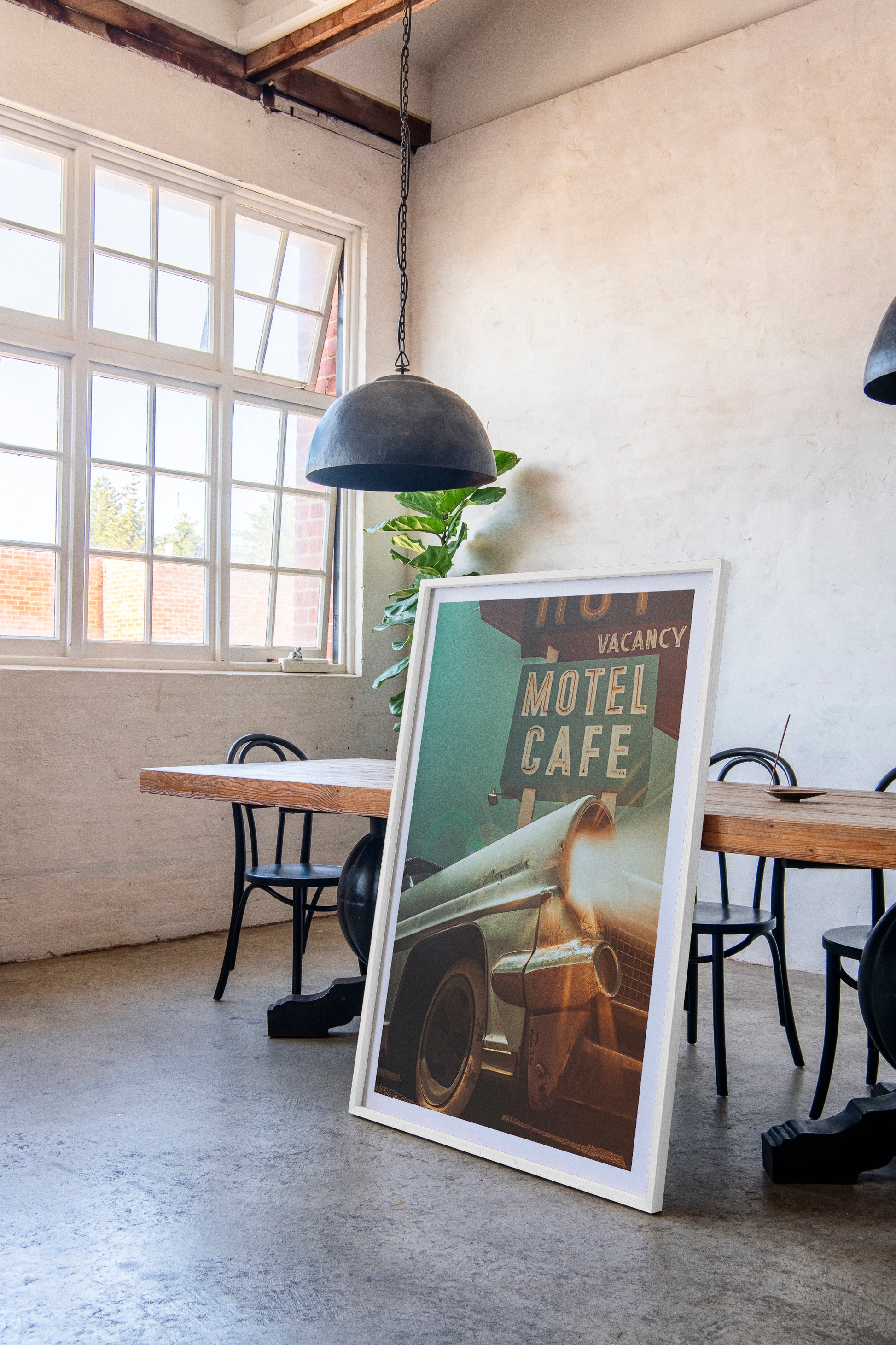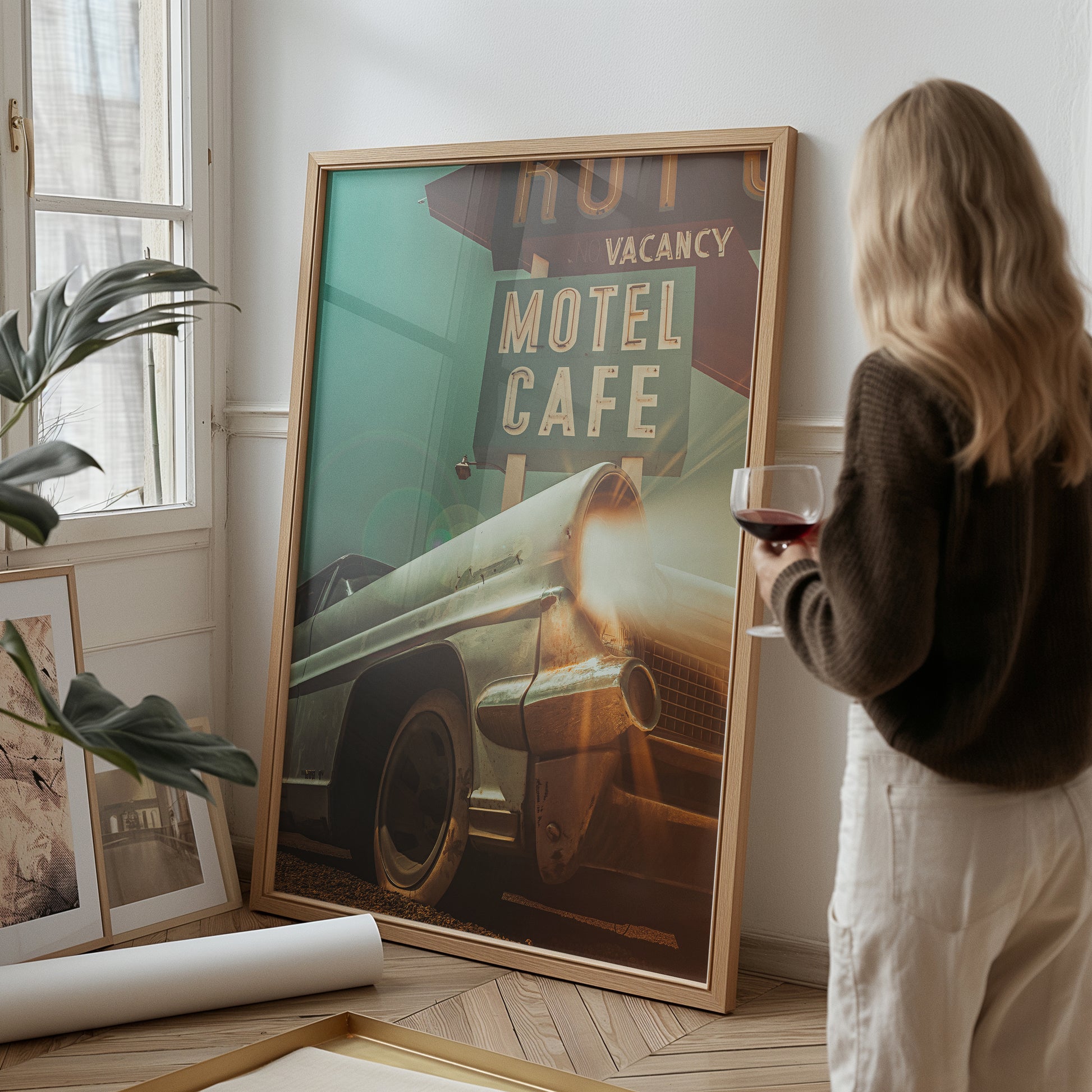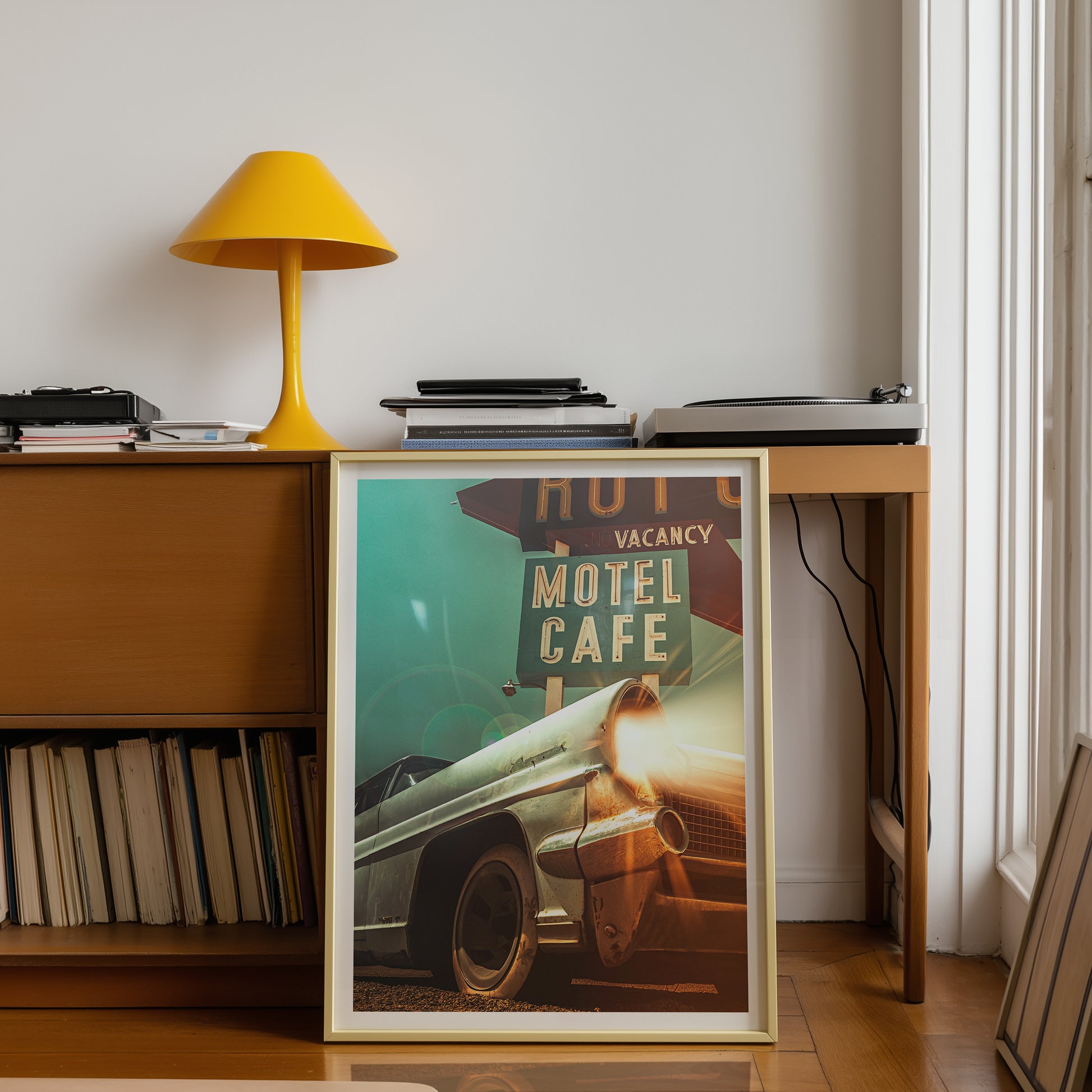 Award-winning cinematic composite built from my own photographs at the Route 66 gas station in Amboy, CA. The car and motel sign are original to the site; I added light beams, fog, and atmosphere for that old Route 66 vibe.